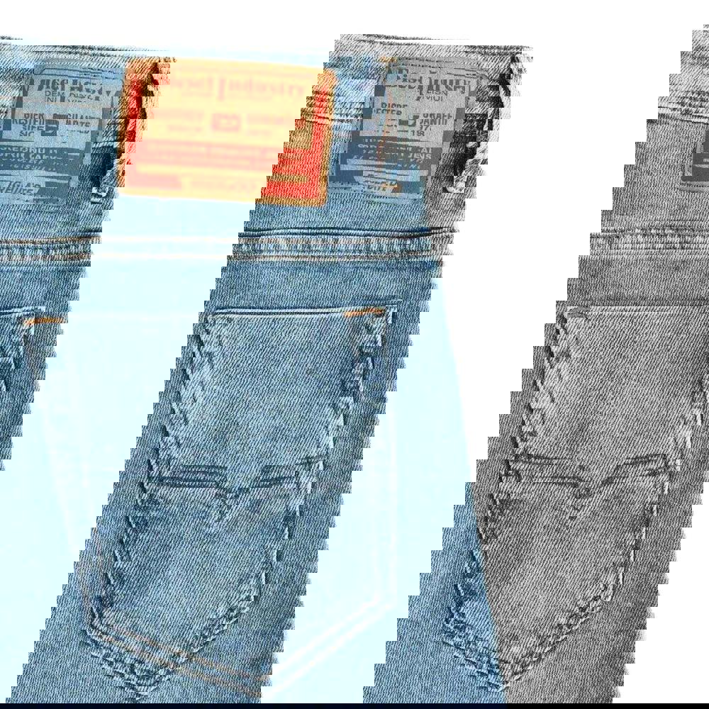 Practical details include a button fastening with a zip fly, plus belt loops for easy pairing with a belt. Storage is provided by a five-pocket layout, finished with a branded patch.