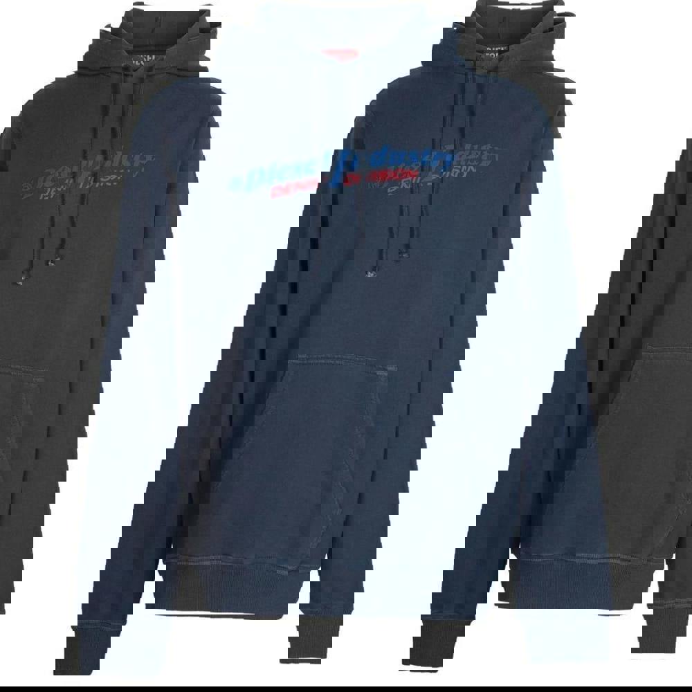 Diesel Industry Denim Division hoodie in navy blue, made from 100% cotton. This regular-fit style has a printed design and a hooded neckline with a sew-on hood and drawstring adjustment. Long sleeves are finished with elasticated cuffs, while the elasticated hem keeps the silhouette neat. A single kangaroo pocket adds a practical front detail. Pull-over fastening.