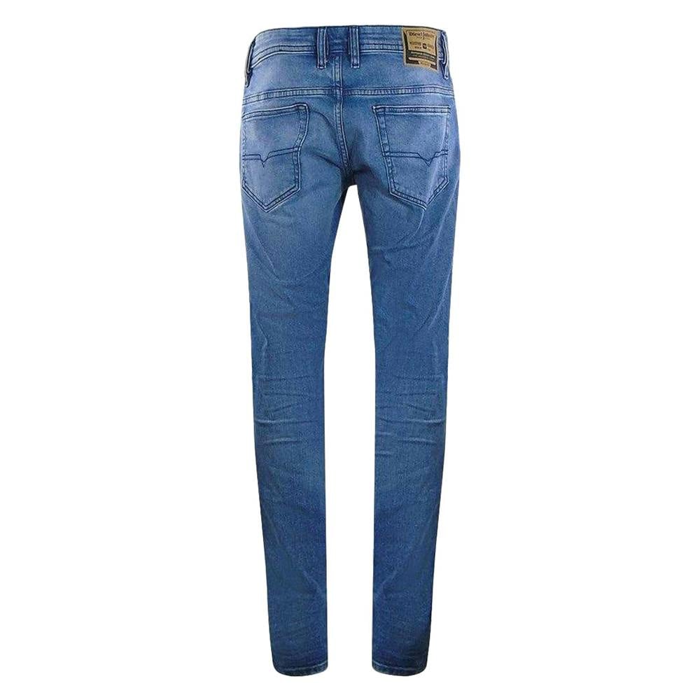 Diesel Larkee-X jeans in light blue denim with a washed finish. The design includes a badge and logo detailing, with a classic five-pocket layout for everyday wear. A button fastening and zip fly keep the front clean and practical, while belt loops allow styling with a belt.