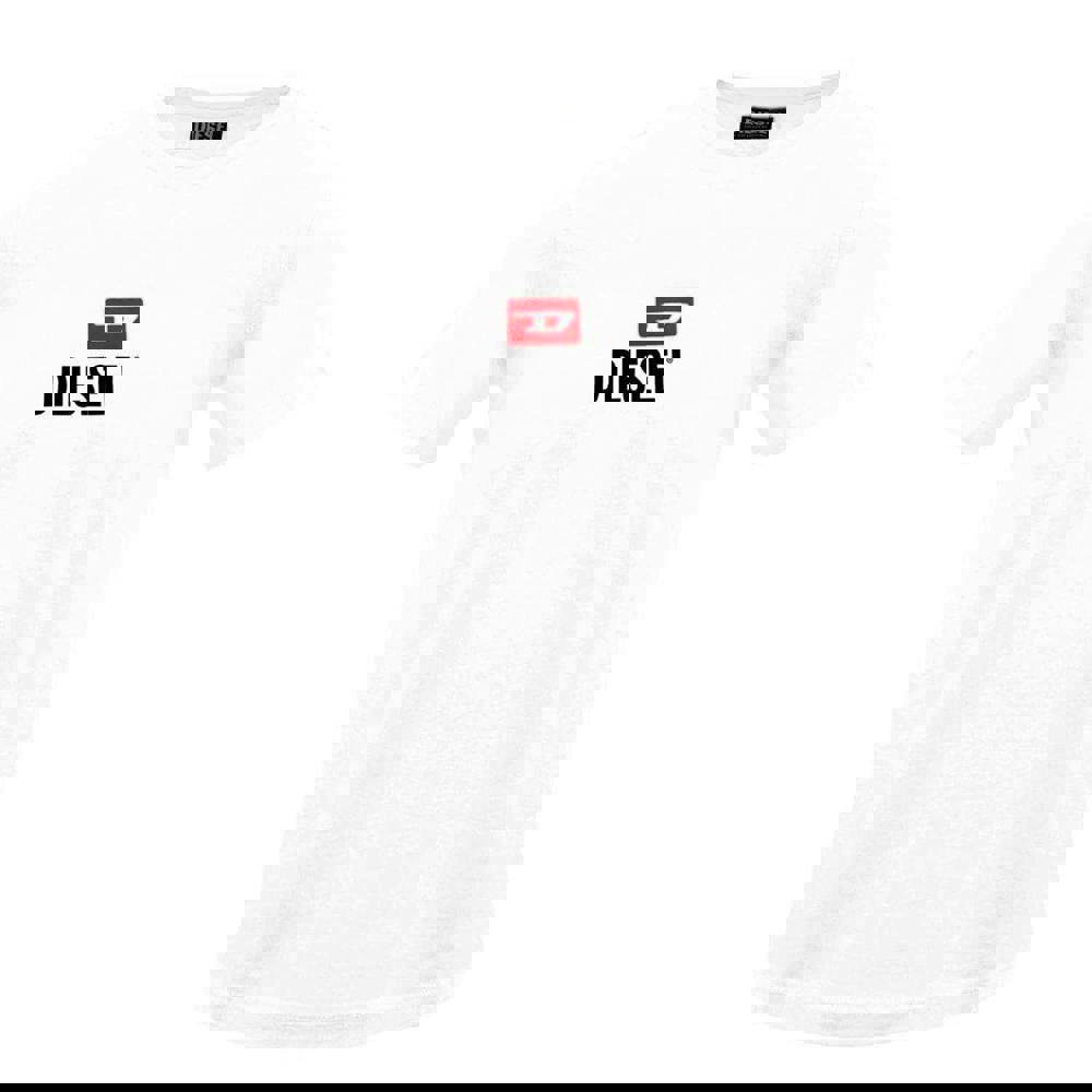 This Diesel men’s T-shirt is made from 100% cotton and finished in white. It has a crew neckline and short sleeves for a classic T-shirt shape. The design includes a logo detail.