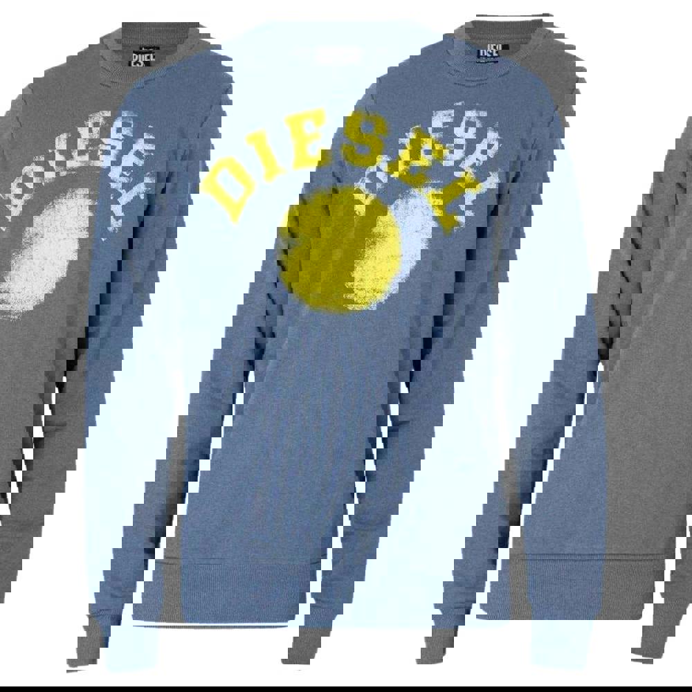 This unisex Diesel sweatshirt comes in blue with a printed distressed dot logo design. Made from a cotton and polyester blend, it has a crew neck with an elasticated finish and a simple pull-over fastening.