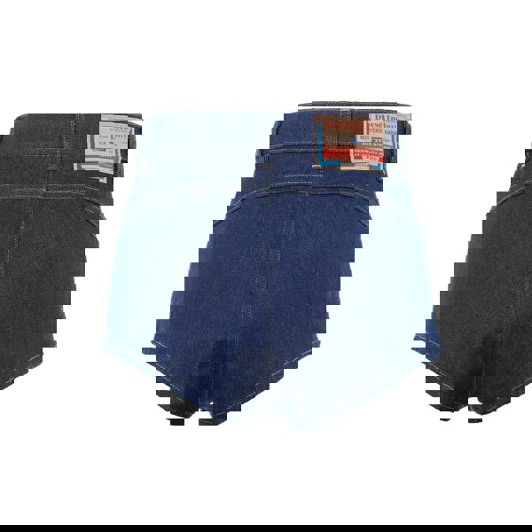 These Diesel De-Lunar shorts come in a plain blue finish with a high waist and top stitched detailing. The design combines classic denim-style elements with practical adjustments, including belt loops and an elasticated waistband with a drawstring. A button fastening and zip fly complete the front closure for a secure fit.