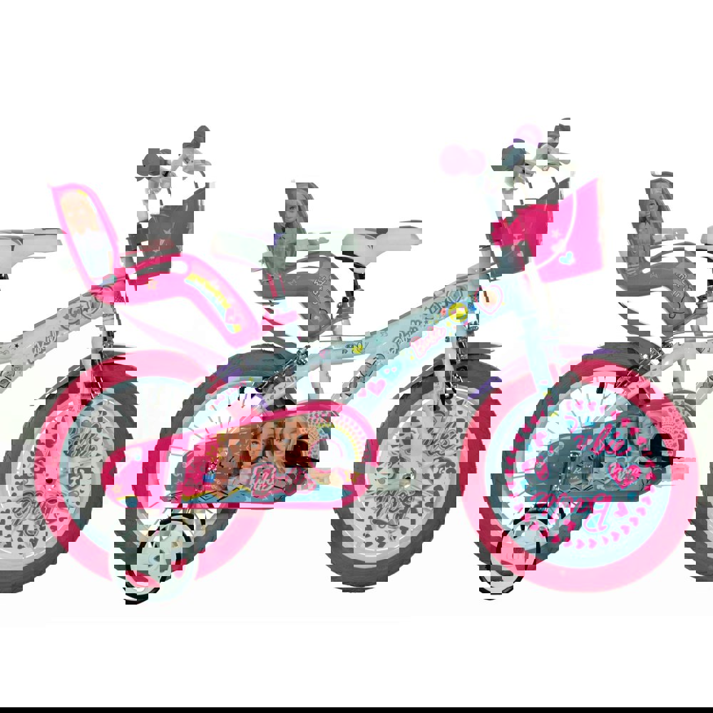 Designed with Barbie fans in mind, the Dino Bikes Barbie 14″ Bicycle includes delightful accessories: a front basket, ideal for carrying essentials, and a rear doll carrier seat, so a favourite Barbie doll (not included) can join the ride. Removable stabilisers are included to provide support and build confidence for beginners. A fully enclosed chainguard adds safety, while the adjustable saddle ensures the bike grows with the child. Find the Dino Size Chart here.