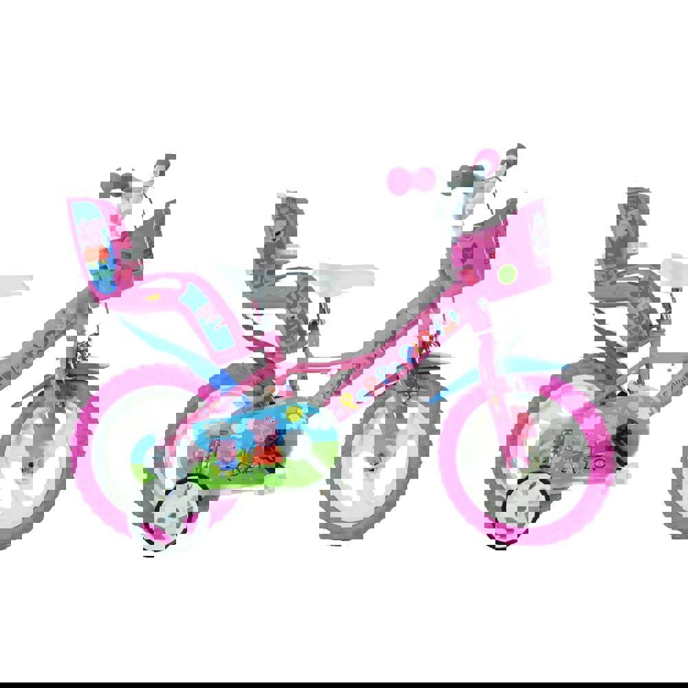 This Peppa Pig Licensed Bicycle comes with front brake, fixed rear wheel, MAG wheels with mudguards, EVA tyres on 12 inch wheels and also comes with removable stabilisers. This bike also has an adjustable saddle and handlebars and also comes with Peppa Pig decals. Suits heights between 87cm to 120cm.