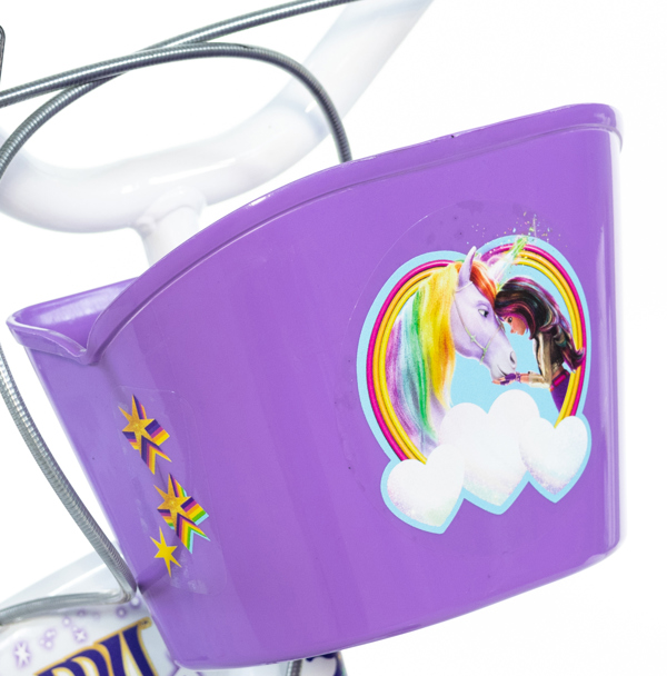 This Unicorn Academy licensed 14 inch bicycle comes with front and rear brakes, freewheeling rear wheel, pneumatic tyres with spoked wheels and mudguards and also comes with removable stabilisers. The 14 inch Unicorn Academy bicycle also comes with an adjustable saddle and handlebars and also comes with a rear doll carrier with strap and a front basket. Suits ages 4 to 7 years. Child height range 95 to 127 cm.