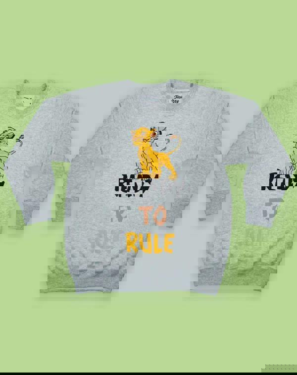 This grey sweater features the adorable king cub Simba standing tall on "Ready to Rule" bold colourful text