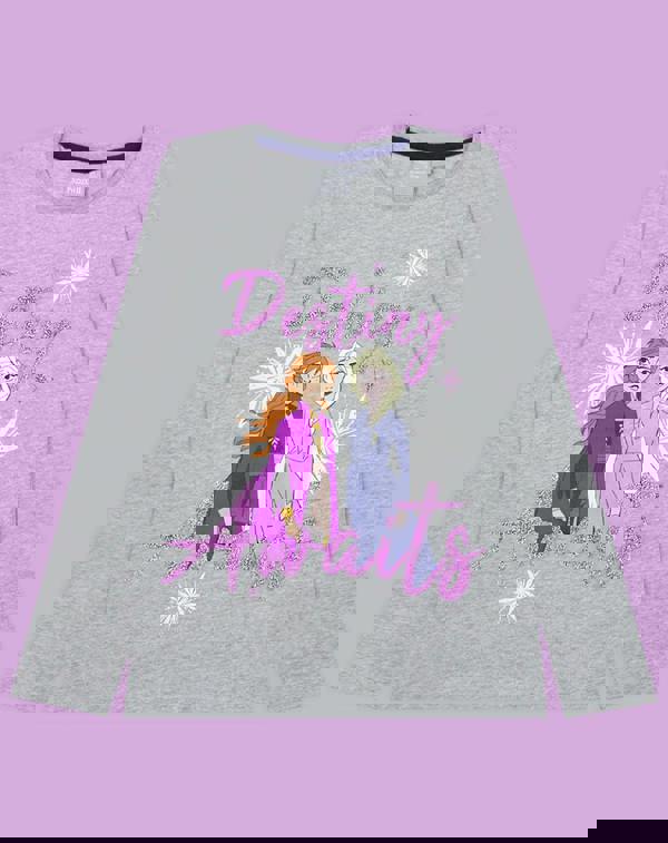 Looking for the perfect addition to your Frozen favourites? Well, look no further! This beautiful long-sleeved crew neck t-shirt, featuring the stunning sisters Queen Elsa and Princess Anna surrounded by snowflakes and the writing "Destiny Awaits" in a fabulous glitter script will bring the magic and sparkle of Frozen to life!