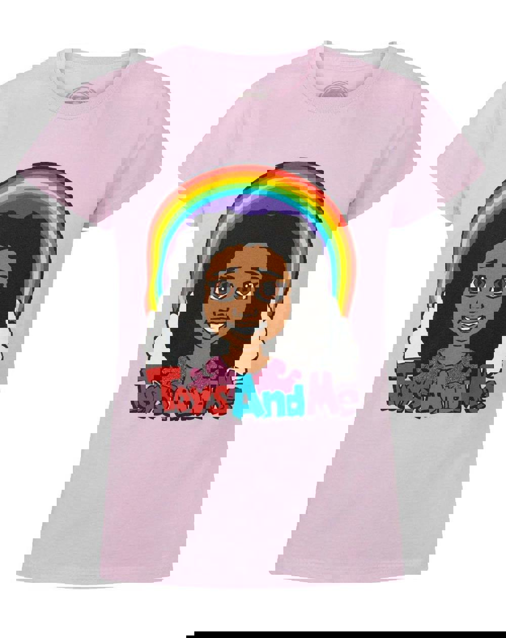This Tiana Logo t-shirt for girls is a super cool addition to your wardrobe! This t-shirt showcases the vibrant Toys AndMe logo featuring Youtube star Tiana against a colourful rainbow background