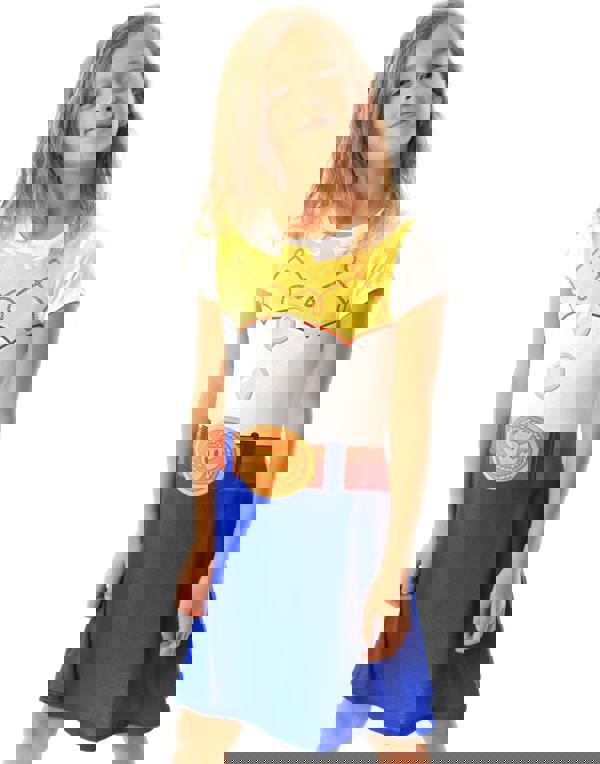 This children's dress features Jessie's classic cowgirl outfit with her embroidered shirt, buckled belt and blue skirt