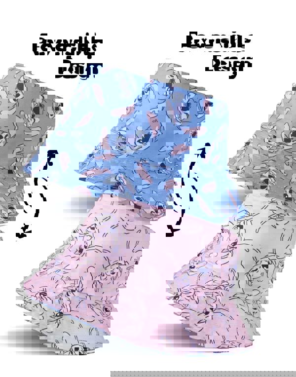 Designed with vibrant colours, this bucket hat features an all-over blue Stitch print on one side and a playful pink Angel print on the reverse, providing versatility for various outfits and occasions
