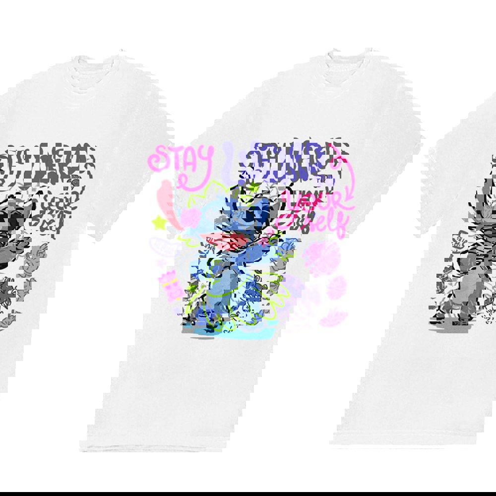An official licensed Disney T-Shirt featuring the Lilo & Stitch - Stay Weird To Yourself design motif. This high quality T-Shirt is available in a white colourway. Comes in a wide range of sizes from Small through XX-Large, subject to availability.