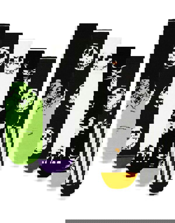 This set includes five pairs of calf socks featuring a variety of designs inspired by the beloved film, including patterns with skulls, stripes, and characters such as Jack Skellington and Oogie Boogie