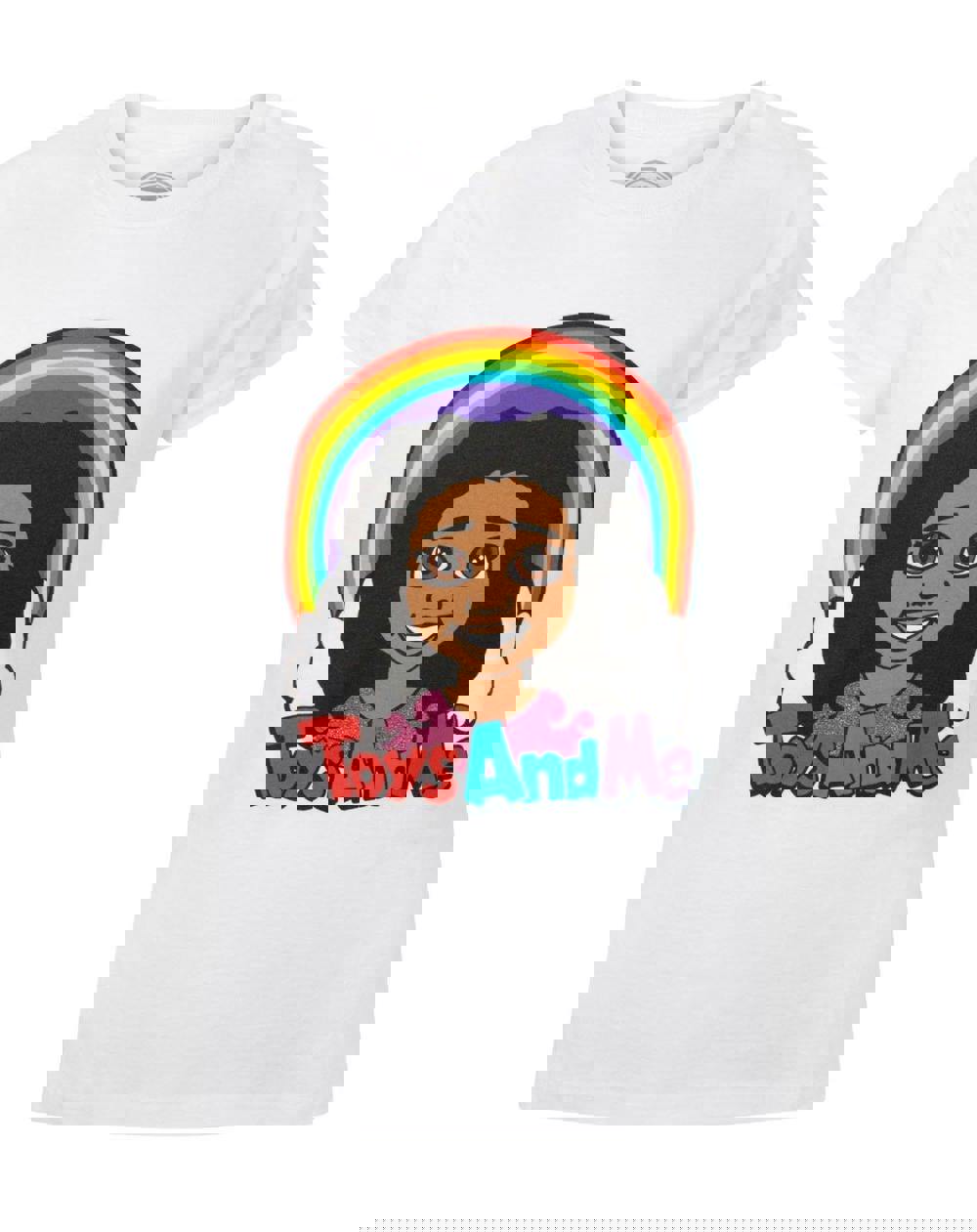 Toys AndMe merchandise brought to you by Noisy Sauce this Tiana Logo t-shirt for girls is a super cool addition to your wardrobe! This t-shirt showcases the vibrant Toys AndMe logo featuring Youtube star Tiana against a colourful rainbow background