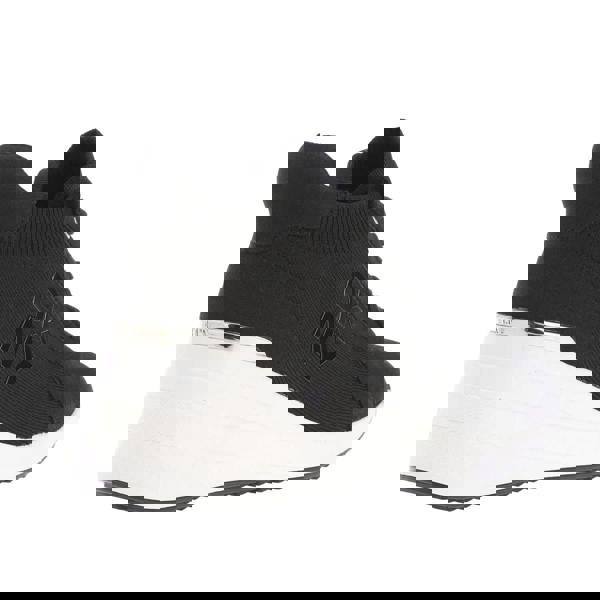 DKNY Kasia platform wedge trainers in black with a low-cut profile and round toe. The upper combines synthetic and textile materials, finished with a logo detail. A lace-up fastening runs through six eyelets for a secure fit, while the padded collar and ribbed cuff add structure around the ankle. Built-in wedge construction is paired with a flat heel, and the rubber outsole completes the design.