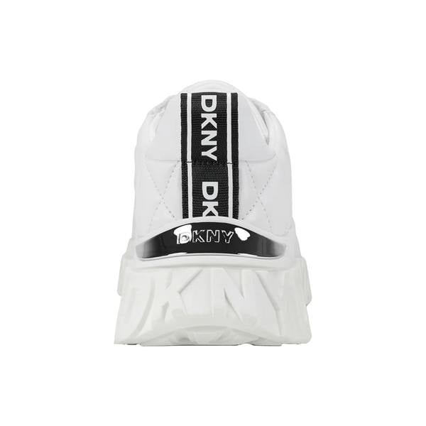 These DKNY Lathen lace up trainers bring a clean, low-cut profile with a round toe and a low wedge sole. The upper combines metallic and rubber materials, finished with quilted detailing and logo branding for a defined look. A pull tab adds a practical touch for everyday wear.