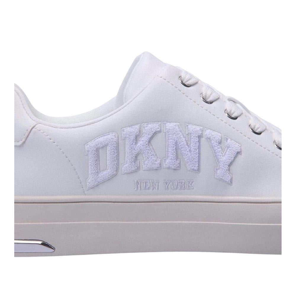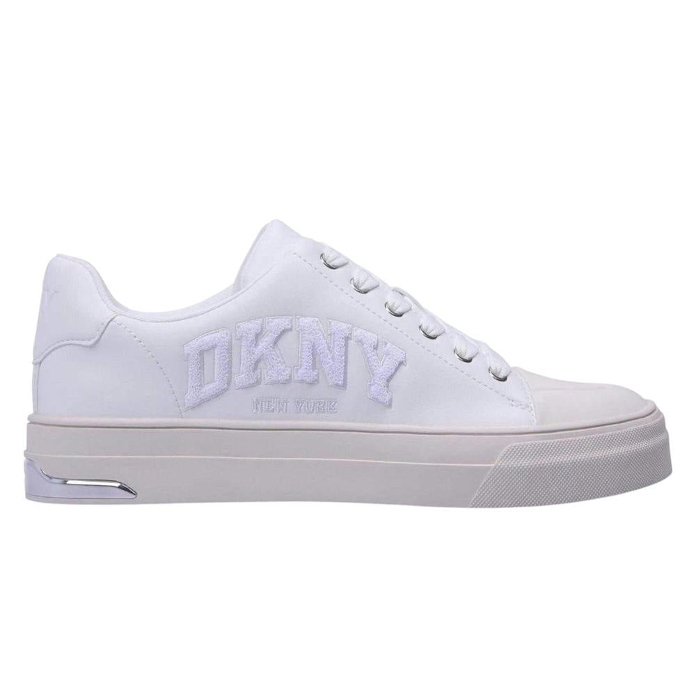 These DKNY New York lace up trainers come in a low cut profile with a clean white finish. The upper is made from textile, paired with a synthetic midsole and synthetic outsole. A round toe and flat sole keep the shape classic, while the lace-up fastening secures the fit through six eyelets. Logo detailing completes the design for a branded look suited to everyday wear.
