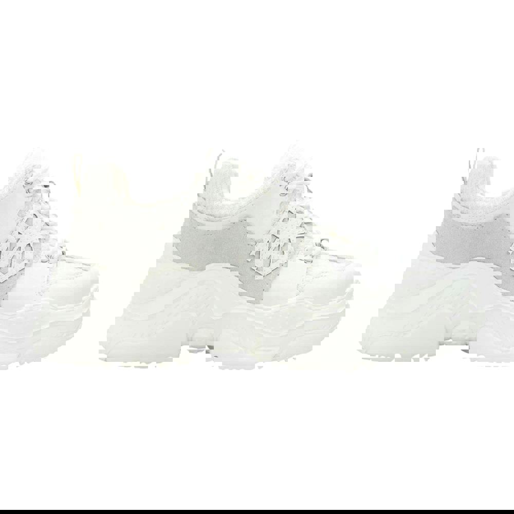 These DKNY Odella trainers combine leather and textile in the upper, finished with a suede panel for added texture. A chunky platform sole and round toe shape create a bold, contemporary profile, while the lace-up fastening keeps the look classic and secure. Branded logo detailing completes the design, making them a clean option for everyday wear.