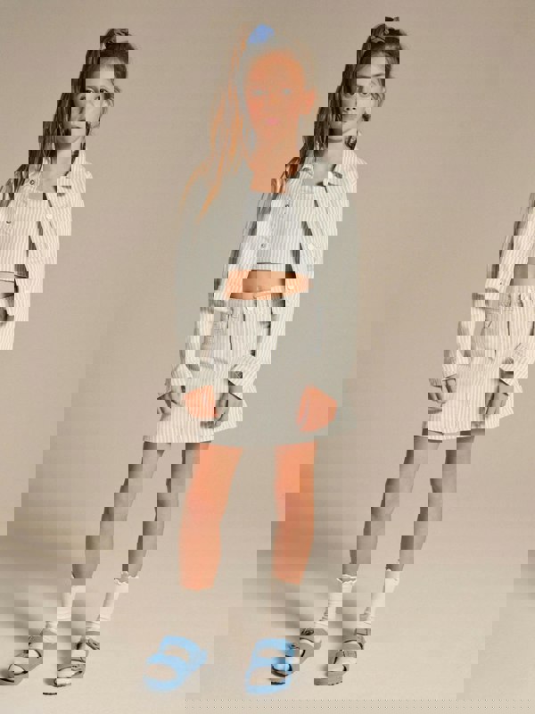 This girls’ Cora crop top by DL1961 comes in blue with a striped finish for a clean, standout look. The cropped cut keeps the silhouette modern, while the ruffled hem adds a decorative detail that lifts the overall design.
