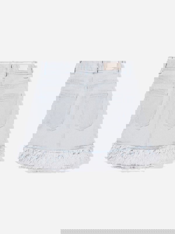 This piece is presented as a girls’ skirt and comes in a blue colourway. The design centres on the contrast of denim and fur trim, creating a standout finish without additional embellishment mentioned in the source.