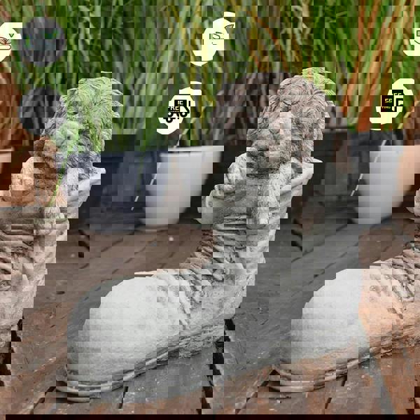 This delightful cute, unusual statue of a puppy sleeping in a shoe will look great as a decoration in your garden, patio or entrance. Such a charming stone garden sculpture would be a lovely addition to indoor or outdoor décor. This sleepy stone cast dog is sure to receive compliments from guests and visitors. A perfect present idea.