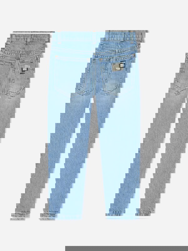 These Dolce & Gabbana Kids skinny jeans come in blue cotton denim with an embossed side logo. The design includes “Milano Dept DG” branding along the leg, paired with a traditional five-pocket layout. A silver embellished branded tag sits at the back, adding a distinctive finishing detail.
