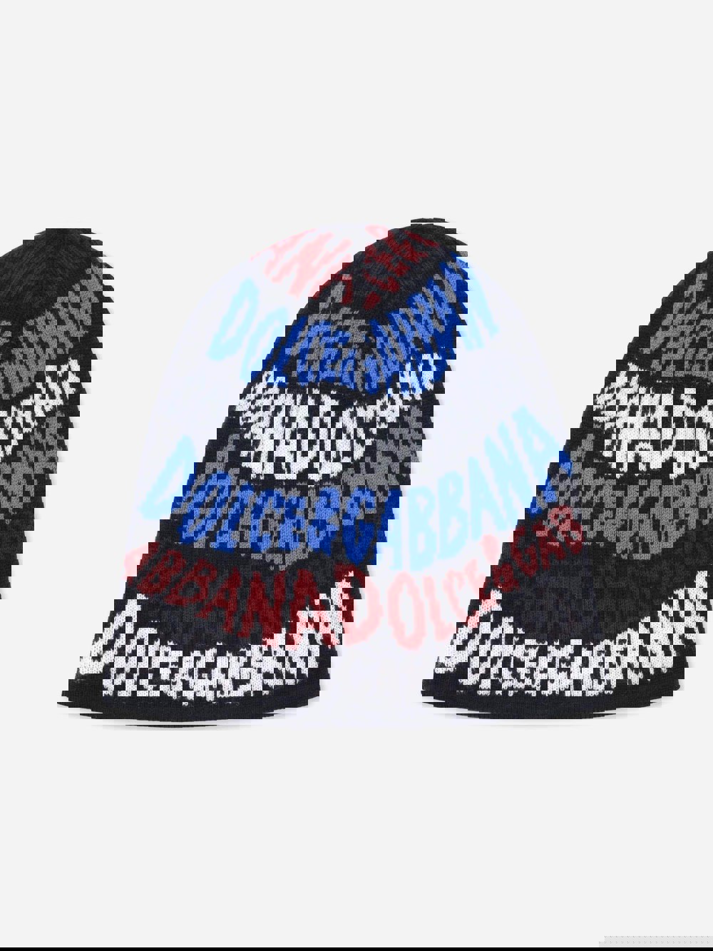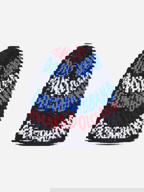 Dolce & Gabbana Kids boys’ knitted beanie hat in wool. The design comes in navy blue with an all-over Dolce & Gabbana pattern and contrasting inscriptions.