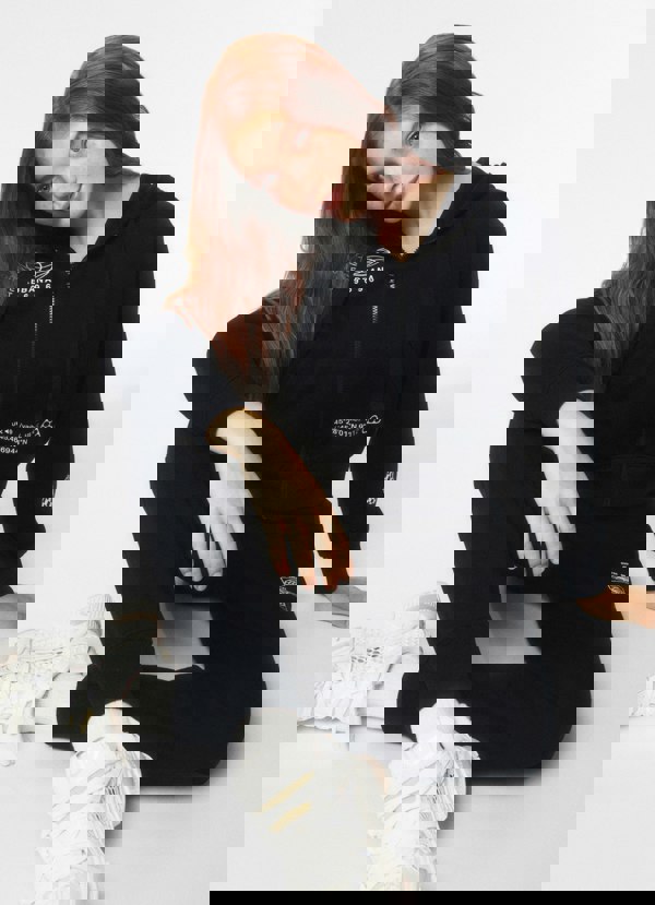 Part of the Dolce & Gabbana DGVIB3 “youth-phoria” collection, this girls’ black zip-up hoodie is made from oversized cotton jersey. Latitude coordinates appear on the front and back, with an equator symbol at the top front and a sphere motif on the left sleeve. Print detailing continues on the exterior of the hood for a consistent graphic finish.