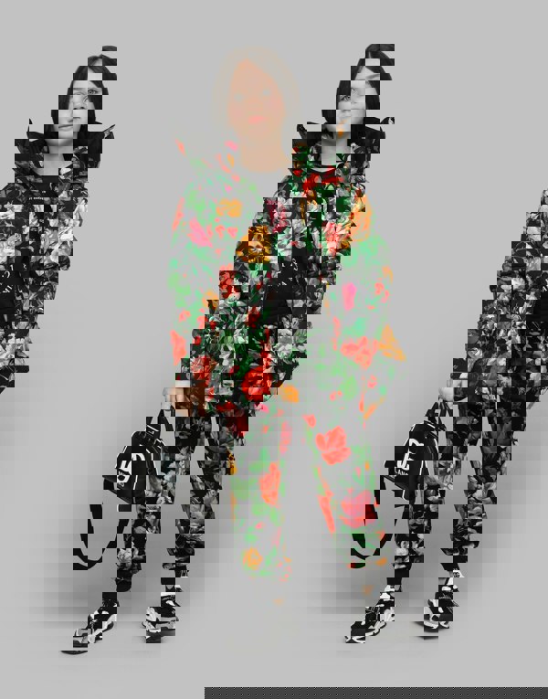 Down padded rose jacket from Dolce & Gabbana Kids, made in Italy. Nylon down construction with an all-over rose print on a black background, finished with recycled real down padding and a lined interior. A detachable hood sits at the neck, with a hood collar secured by metal press-stud buttons.