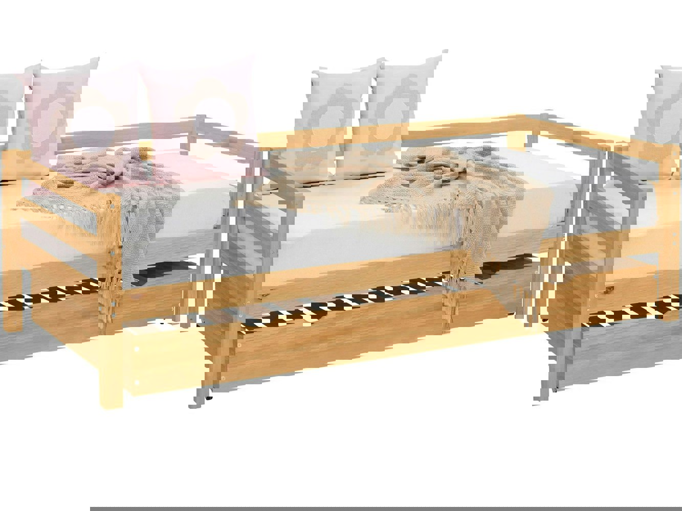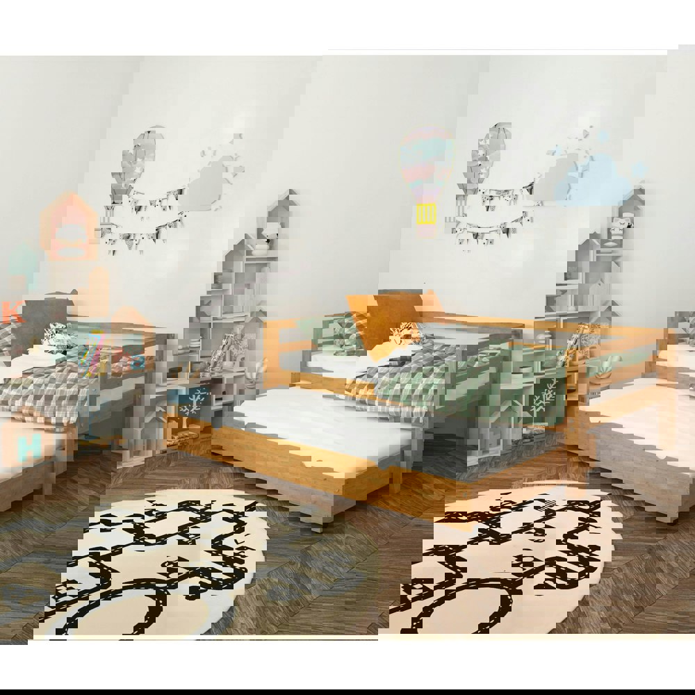 The bed including bed drawer stylishly enhances the ambience in the children's room or guest room. The look in the distinctive country house style is emphasized by the framing in the wall area and at the head and foot end. The set is equipped with a frame so that only the right mattress is required. The drawer can be used as a second bed for your best friend. This sleeping furniture is made of highquality solid pine wood that is FSCÂcertified.
