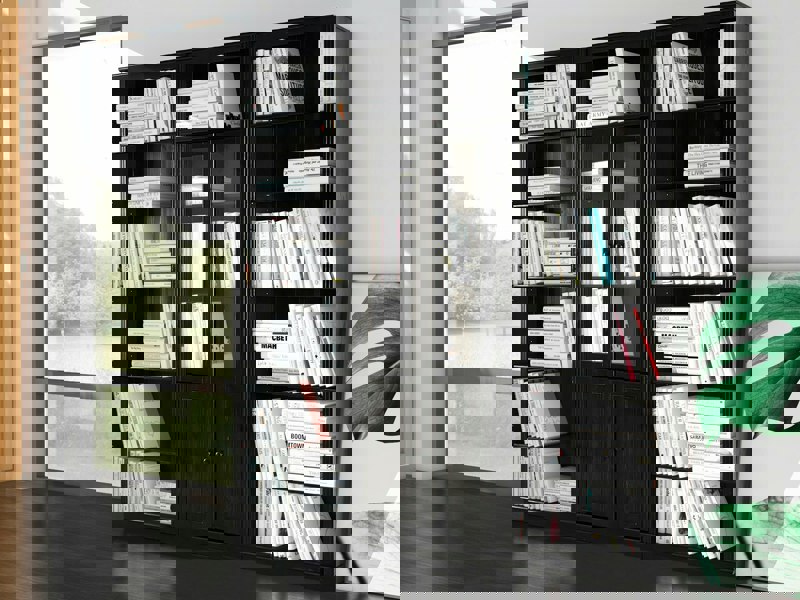 This set includes three bookcases the middle one feature glass doors and wooden doors providing a versatile storage solution