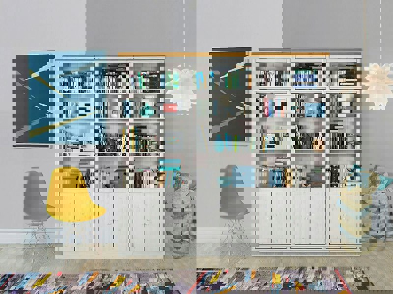 Each bookcase features wooden doors providing a versatile storage solution