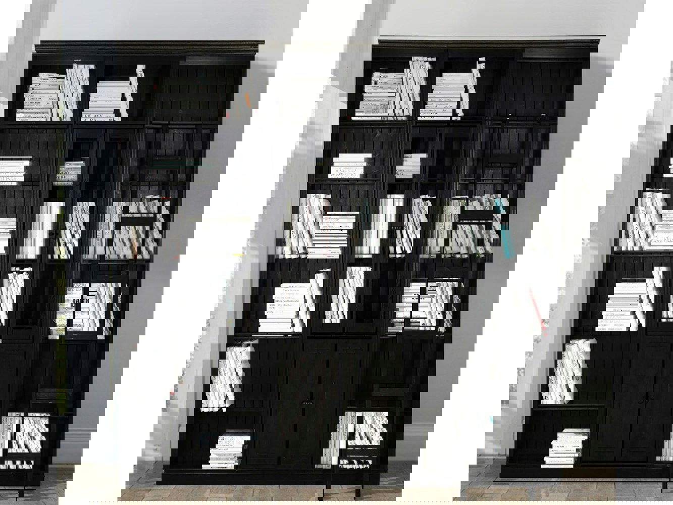 This set includes three bookcases the middle one feature glass doors and wooden doors