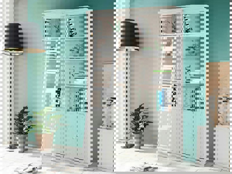 Each bookcase features wooden doors providing a versatile storage solution