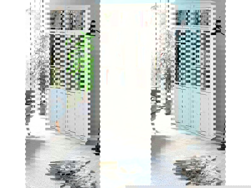 Each bookcase features both glass and wooden doors providing a versatile storage solution