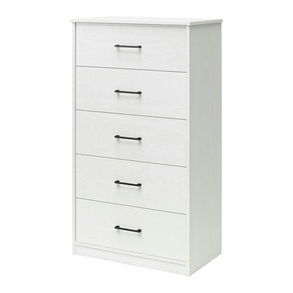 This five-drawer dresser is as simple to put together as it is sleek. Featuring a design that allows for quick and easy assembly by anyone, this piece gives you an elevated look without the hard work. Grooved wooden panels are designed to stay in place so you can effortlessly snap them together and then move on with your day. With clean lines and a timeless silhouette, this dresser boasts generously sized drawer pulls, and a lamination process ensures a consistent white finish throughout. Wide and substantial, this dresser features six spacious drawers that slide smoothly on a metal glide system. Add understated elegance to your bedroom with this casual transitional piece.