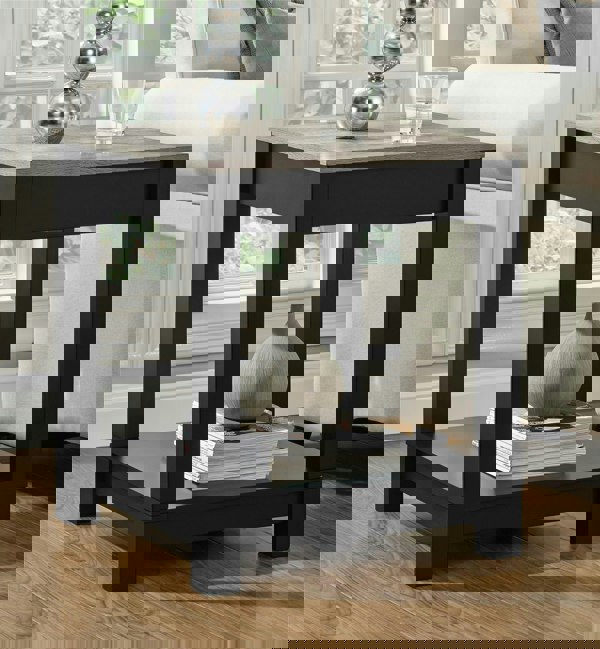 The Carver End Table combines functionality and contemporary style. The table features a matt black finish that will fit seamlessly into many decor styles, and a distressed brown woodgrain finish on the top makes the design pop. In addition to the table’s charming looks, it also adds extra storage space to the room. The flat top is perfect for a lamp, decorative pieces, remotes and other accessories, and the open bottom shelf offers space for larger items. You can’t go wrong with this end table in the room. It’s made of painted MDF and laminated particleboard, and it stands at 23. 3”h x 20. 1”w x 20. 1”d. Two adults are recommended for proper assembly.