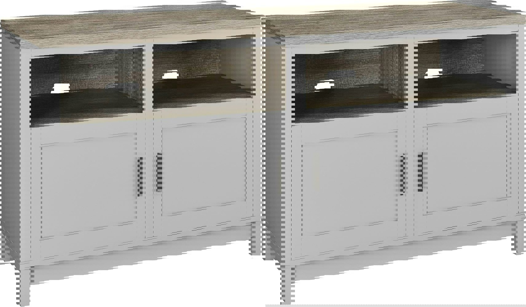The Carver TV Stand keeps your media devices and accessories organized and your entertainment space free of clutter. With 2 open shelves and 2 cabinet spaces for concealed storage, the TV stand offers plenty of room for your media players, gaming systems, controllers and movies. Made of painted MDF and laminated particleboard, the stand has a sturdy build that supports most flat-panel TVs up to 60” with a maximum weight of 95 lbs. The TV stand’s matt black finish, distressed woodgrain accents and pewter door handles create an elegant look that will complement a number of different decor styles.