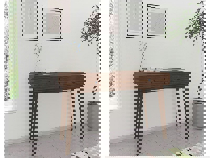 This desk offers plenty of workspace and is a real eyecatcher in any room. It fits perfectly in a home office studio or stylish childrenÆs or youth room. It is a great place to do your homework. The desk offers a comfortable storage surface. The integrated drawers provide practical storage space for smaller items such as notebooks pens and other office supplies. The modern and simple design harmonizes with existing furniture. Combined with a desk chair you can set up a great study and work space.