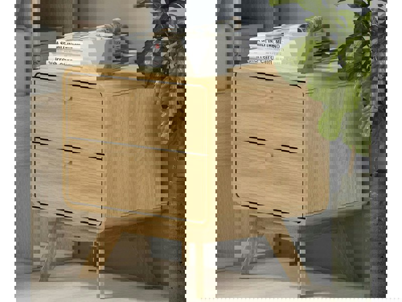 Upgrade your bedroom with this stylish nightstand in modem scandinavian design. 2 drawers provide enough space for small things. It's made of easycare laminated particleboard. The nightstand completes its look with wooden knobs harmonized colors rounded corners and splayed legs. It can be assembled easily with included hardware bag. With timeless design this nightstand is simple to mix and match with all existing décor styles of your room.