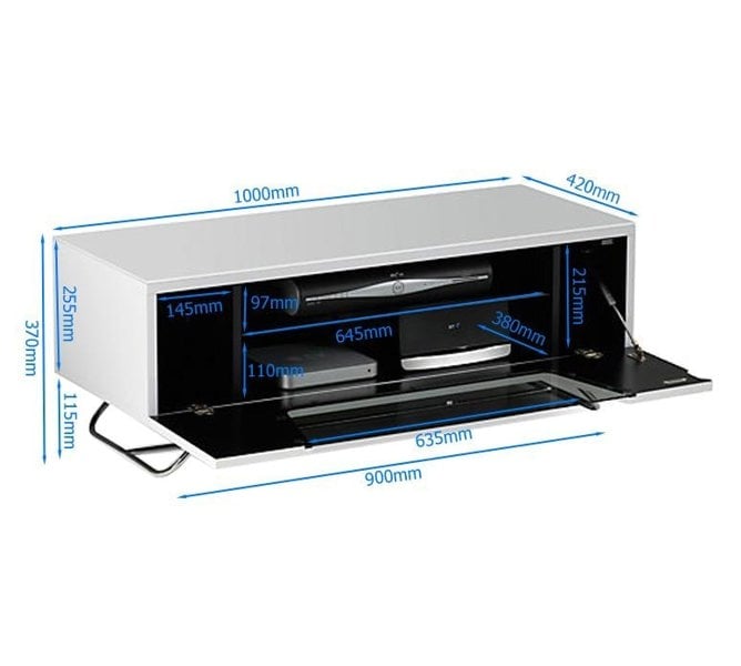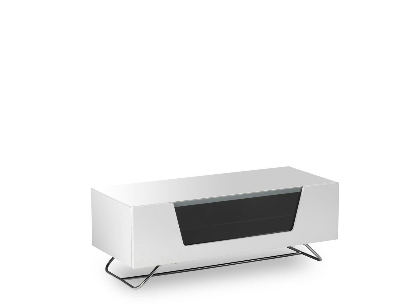 Featuring a coloured high gloss finish clad in matching glass and supported by a discreet steel frame, the Chromium range of TV stand epitomises contemporary furniture designs. The flip-down door is complete with IR friendly glass, soft opening hinge and magnetic catch, and holds a toughened glass shelf and 2 storage compartments.