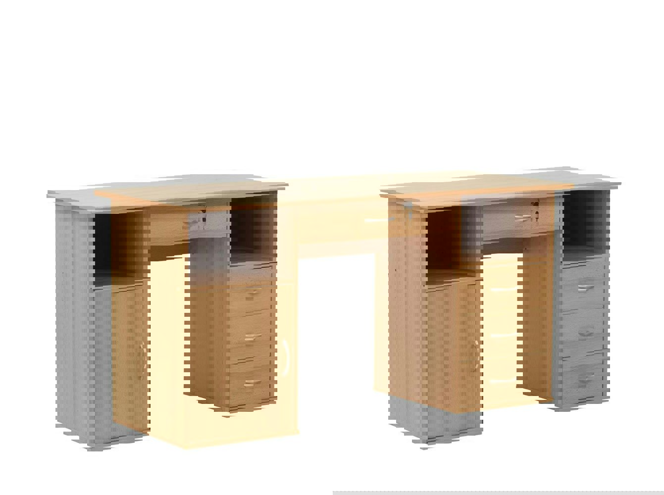 The Dallas is a traditional style desk boasting a wealth of storage space, in a beautiful Beech effect with chrome handles. It features a central lockable drawer, along with 3 additional stationery drawers, storage cupboard and 2 storage compartments, making the Dallas both functional and attractive.