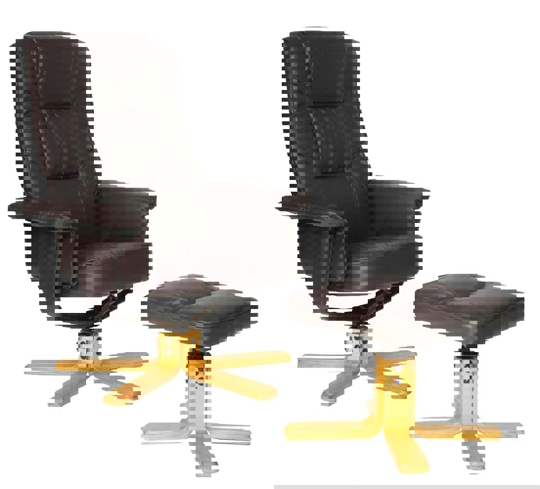 With a soft faux leather upholstery and beautiful wooden base, the Drake Recliner and Footstool will add luxury to any home or office. This generously padded one-seater comes complete with matching footstool and padded headrest, and the hand operated recline function is easy to assemble and use.