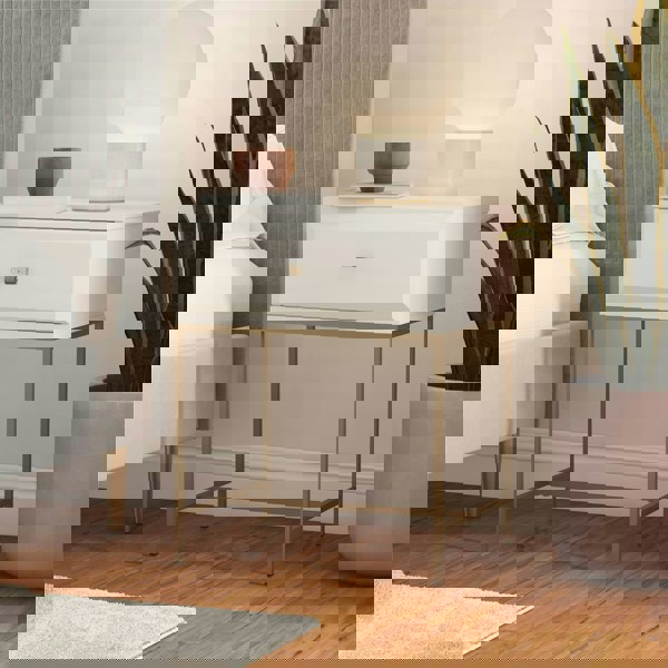 Set the tone for the quintessential bedroom oasis with the unapologetically stunning Effie collection by Mr. Kate. We are entirely convinced you can never go wrong with neutrals and soft color palettes when serenity is the desired result. And let's face it, we could all use a little more tranquility in our lives. With her calming hues of gray, white & pale pink, Effie lures you in with her charm and entices you to unwind after a long day. A large jewel-shaped drawer with cushion cut drawer front, embellished with a gold accented Lucite drawer pull, offers the ideal bedside compartment for all your evening essentials. The Effie Nightstand is crafted from ultra-durable painted MDF, with a gold powder coated metal frame and finished on all sides for versatility. The fun doesn't have to end in the bedroom. Place the Effie Nightstand in an entryway or living room to use as an attractive side table.
