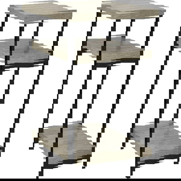 Keep your book, remote or drink conveniently within arm’s reach with the Elmwood End Table. This End Table will sit perfectly next to your favorite chair or sofa and is both beautiful and functional. Place a lamp or family photos on the top surface. Use the 2 lower shelves for your remote or to keep books and magazines in one handy space. The textured weathered oak finish and Black metal legs bring an instant upgrade to any space.