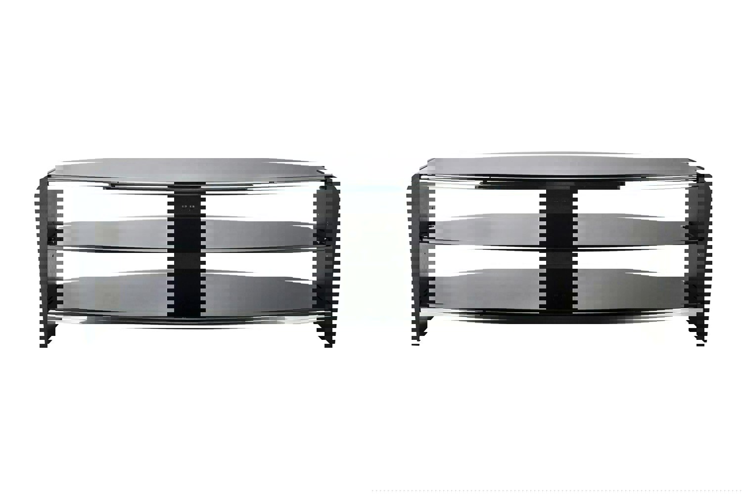 With its elegant, open and timeless design the Francium range is sure to fit into any décor. It features 3 coloured glass shelves supported by beautiful curved wood supports finished with stylish chrome detailing, with rear cable management.