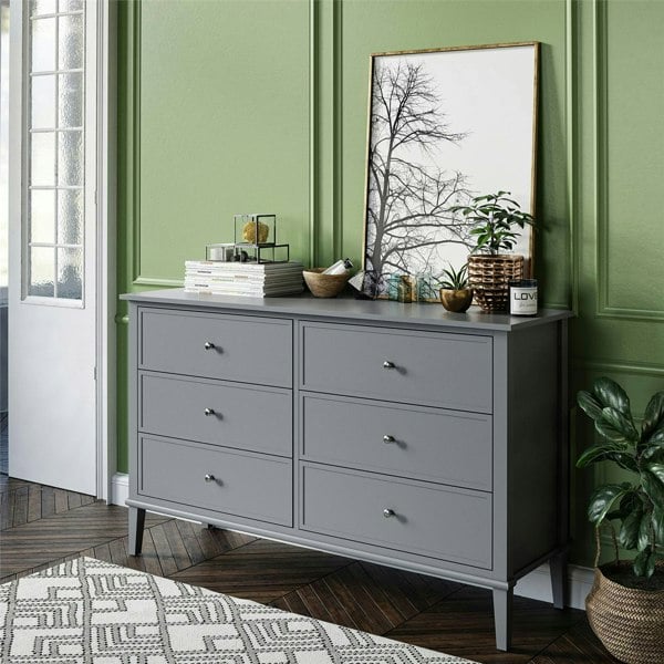 Upgrade your bedroom with the Ameriwood Home Franklin 6 Drawer Dresser. The beautiful off white finish on the painted MDF will look great with any style and décor and will last for years to come. The 6 drawers can organize all of your folded clothing and extra linens to keep your bedroom and closet clutter free. Each drawer features durable metal slides and are finished in a linen look paper to prevent clothes from snagging on raw edges.