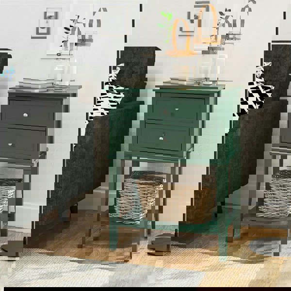 Make sure your essential items are always easily accessible with the Ameriwood Home Franklin Accent Table with 2 Drawers. This elegant piece is a perfect addition next to your bed or sofa. The table comes with 2 spacious drawers that can store your remotes, coasters, magazines, and other household items. You can also place a lamp on the large top surface or keep your drink close at hand. The lower open shelf is perfect for organizing your reading materials. The straight lines and beautifully painted finish of this piece add a touch of color to your space. Made of durable painted MDF and real wood legs, this Accent Table is built to last.
