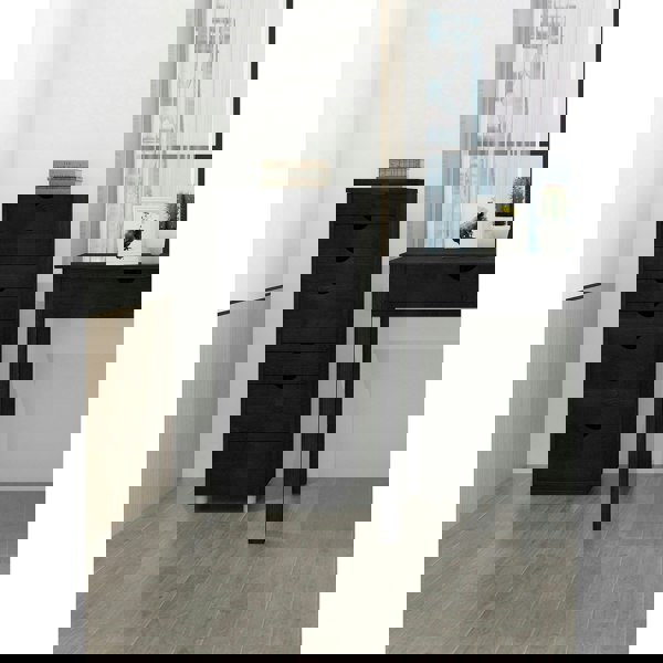 The chest of drawers offers a modern design and plenty of storage space. Its wood look and the protruding top panel give the high sideboard a stylish look. The front of the cupboard impresses with many drawers in different heights which have milled recessed grips. They can be pulled out far so that larger objects can also find a place in them. The chest of drawers is equally suitable for the home office the youth room the hallway or the livingdining area and can be combined in many ways. The drawer cabinet is made from FSCÂcertified solid wood and is characterized by its highquality workmanship and easycare surfaces.