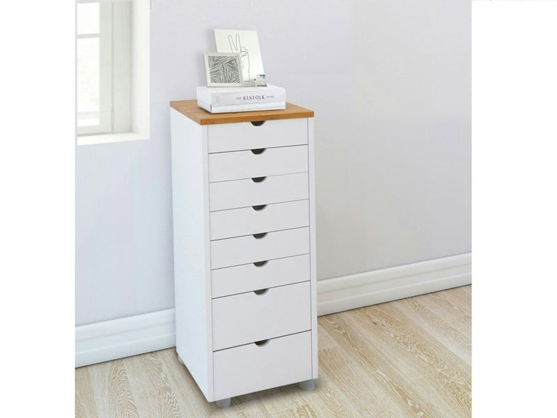 This spacious chest of drawers brings a lot of storage space into your room. It is equipped with several drawers in which documents items of clothing or small items can be stored. Each one has a recessed grip so that it can be opened easily. With compact dimensions the chest also fits into small rooms. Suitable to be used in different spaces a practical storage solution in the hallway next to the desk or in the bedroom