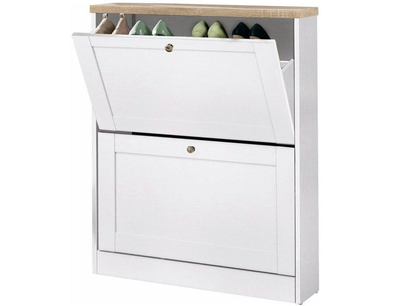 Add a stylish touch to your entry room with this practical shoe chest. Its design harmonizes with both industrial and country house style interiors. The cabinet is made of highquality FSCcertified particle board. It has an easycare surface and a sturdy build. The two flip drawers provide enough space for multiple shoes. The shoe chest can be assembled easily with the included hardware bag. With its timeless design this shoe cabinet fits in with all furnishing concepts and living styles.